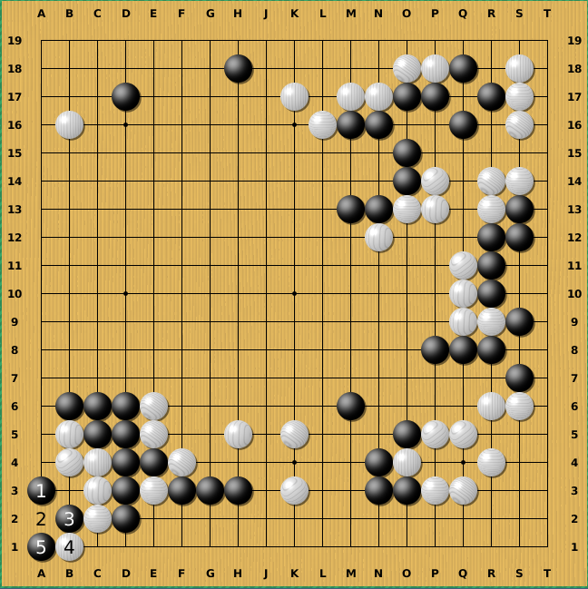 結構よく出てくる形で,コウって書いてるけど,実は黒からA5に打つと白死です.黒A5に対して白A4は黒C1白B1黒A2で五目中手.他に,白A2には黒B1白C1黒A4白A3黒B2白A6黒5みたいに打って死に.こういう形はいきなり中からいくより外から狭めていった方が良いケースがけっこうある.