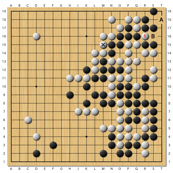 ちなみに、✕が加わって駄目が詰まると、白1に黒Bと受けられない。黒Bには白Aで、黒は部分的には死に形。前図のような手順で白にも二眼なくなるが、攻め合いはどうやら白勝ちみたい。