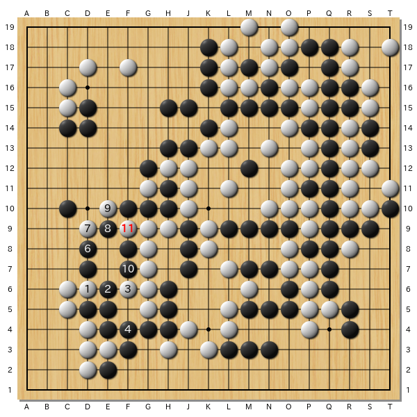 下図まで、とんでもないコウ。右下方面に白からコウ材がたくさんあってまずそう。黒12で13なら下辺の黒は無事だが、白12と取られて、形成が急接近する。