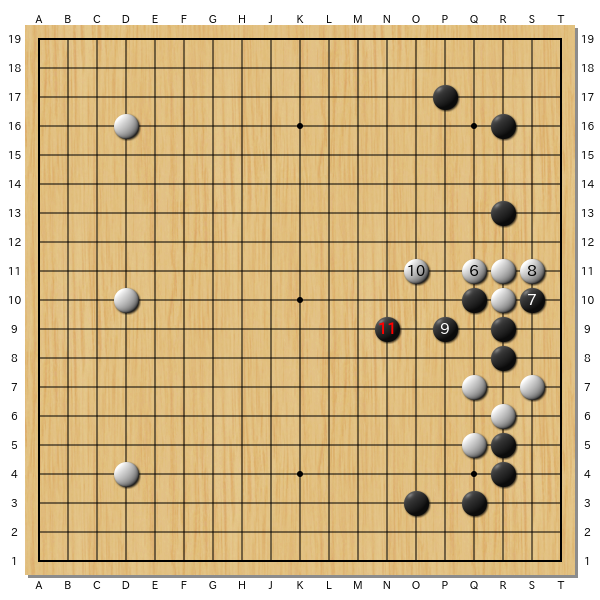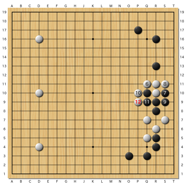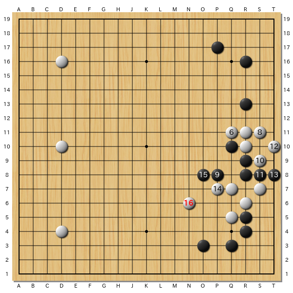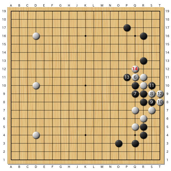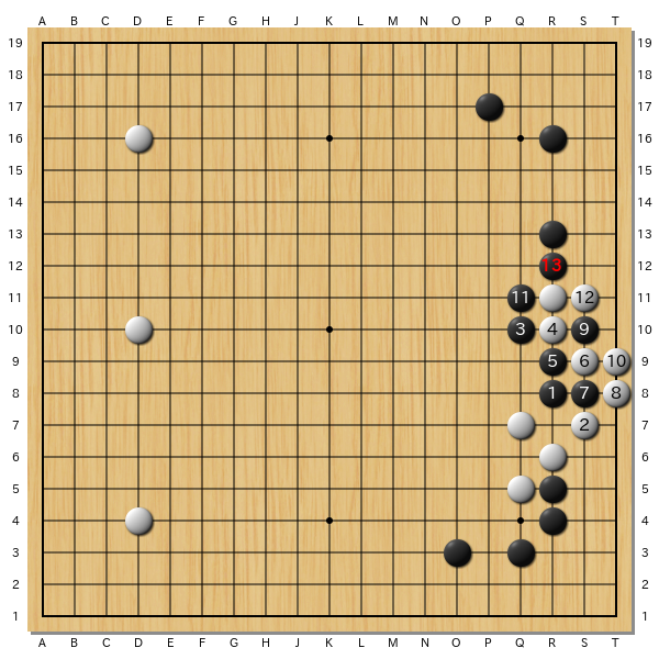 13までが打ち込み定石、と教科書には書いてある。確かにこれなら黒が厚いと思うのだが・・・