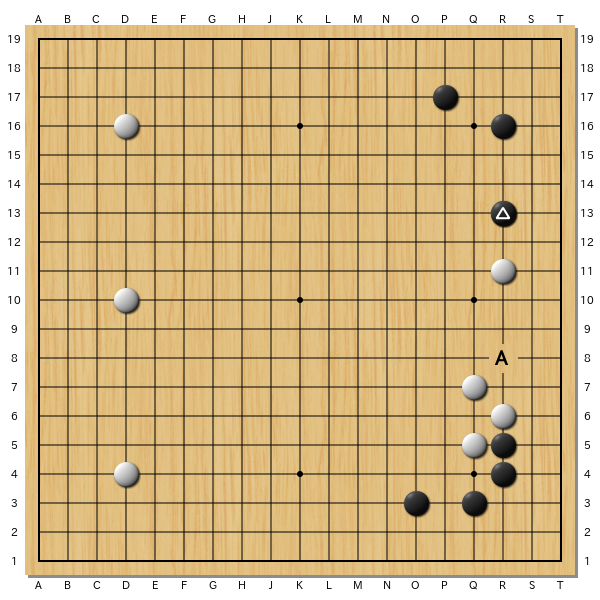 黒△で、右下の白が切り離されたところ。白の応手は。