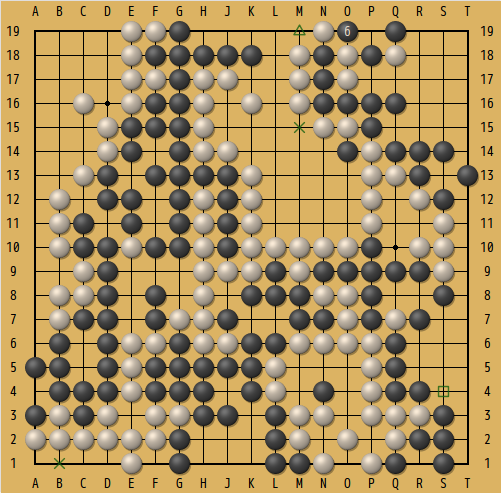 白 24と固く守って来たので、効いてくれたら儲けと思って打った黒25のノゾキにツいででくれた。白28から左下を動き出された時に、黒29以下の応対はさ すがに甘かったかも。ただしドサクサに紛れて小目の白石を抜いて隅に替わる(この辺の手順がやや曖昧)。筋悪ながら何とか真ん中へ頭 を出して、左辺の白の目が完全ではない。これ以降の正確な手順はもう思い出せないが、この一団への攻めが上手くいって、最後は中押し勝ちになった。