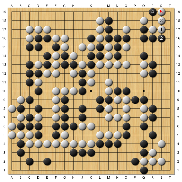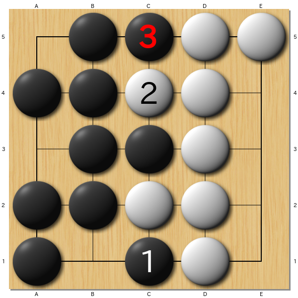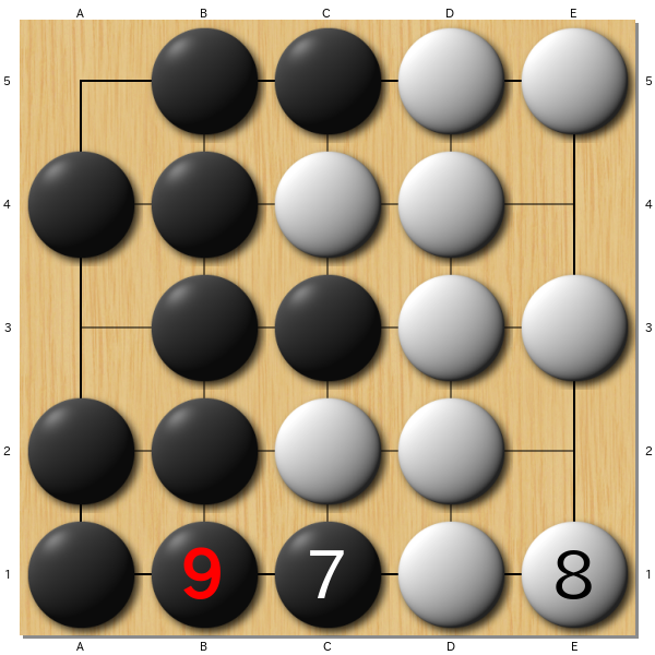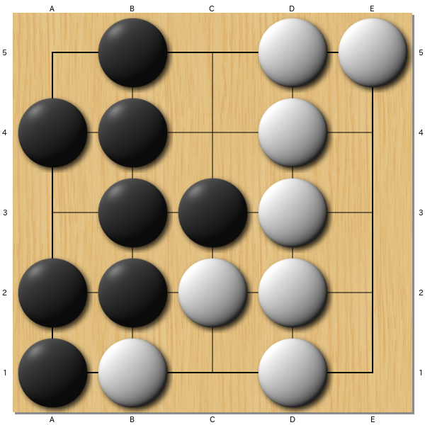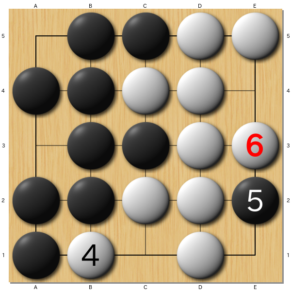 5路盤だけど原理的には19路でも同じことができるはず。今黒番。アゲハマはなし。日本ルールなら半コウ取ってついで黒の1目負けだが。