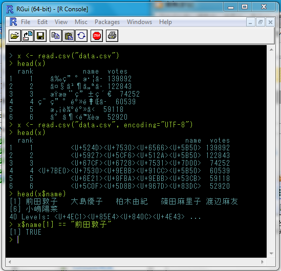 すると、データフレームの表示がユニコード表示になる。ベクトルで抜き出して表示するときちんと日本語になるし、文字列の比較も上手くいく。