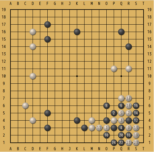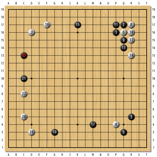 下図は第3局の序盤(黒番)。それまで星8割・小目2割といったところだったので、気分を変えて高目&目外しでいく。23手まで、多少稼がれた感もあるが、左辺を割打ちして悪くない気分だった。