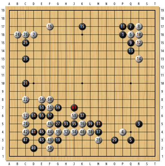 白 24と固く守って来たので、効いてくれたら儲けと思って打った黒25のノゾキにツいででくれた。白28から左下を動き出された時に、黒29以下の応対はさ すがに甘かったかも。ただしドサクサに紛れて小目の白石を抜いて隅に替わる(この辺の手順がやや曖昧)。筋悪ながら何とか真ん中へ頭 を出して、左辺の白の目が完全ではない。これ以降の正確な手順はもう思い出せないが、この一団への攻めが上手くいって、最後は中押し勝ちになった。