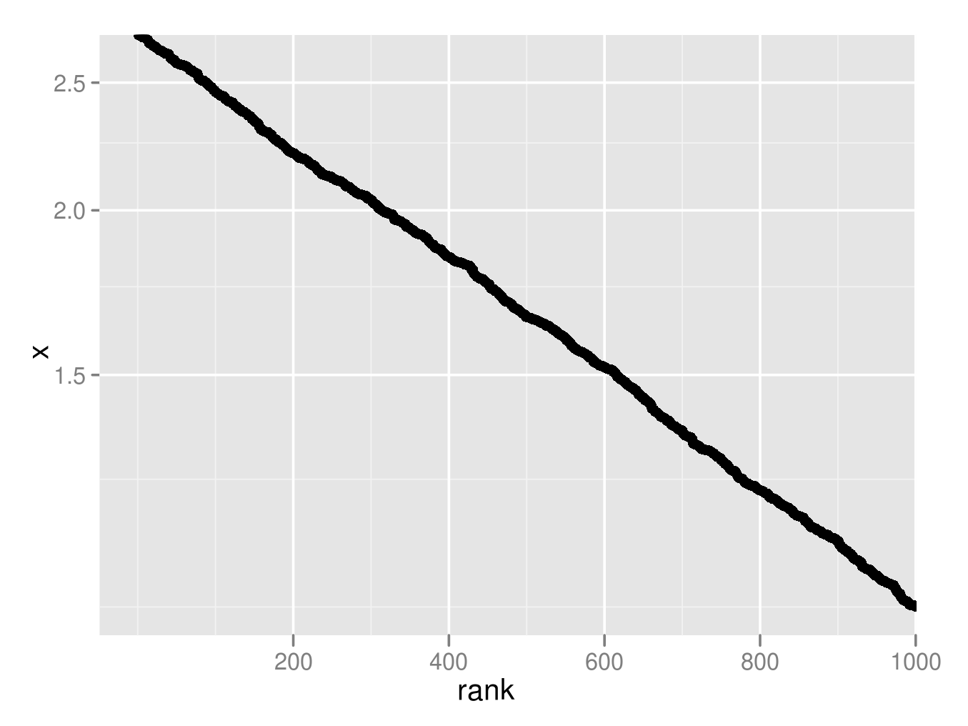 今考えたいのは、「このようなrank-frequency plotを導くようなxの分布は何か」、ということだ。当初は考えもなしに「そりゃ指数分布だろ」と決め付けていたのだが、この第一感は怪しい。