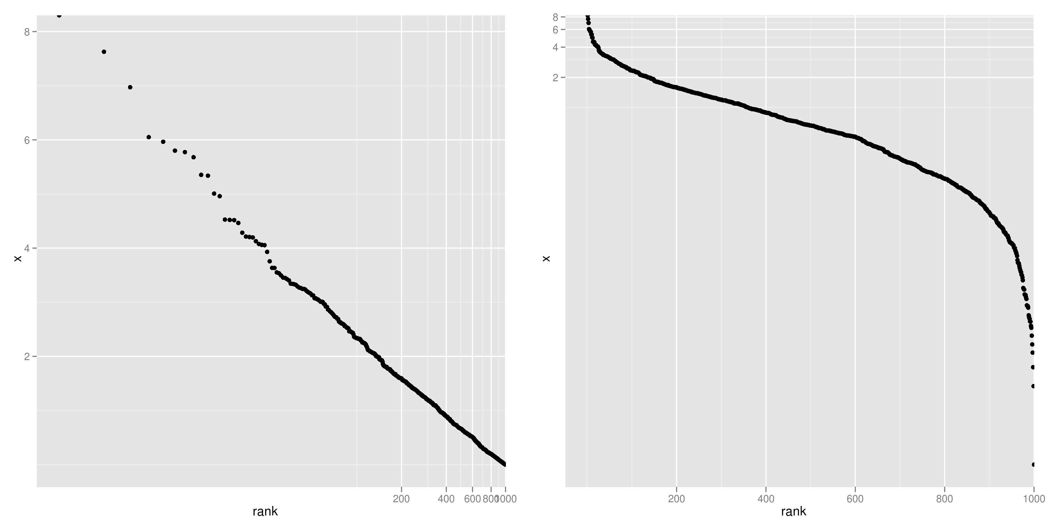 下図は、指数分布に従う乱数について rank-frequency plotを描いたものだが、順位にのみ対数を取る(左)と直線になることが分かる。一方、y軸のみを対数軸とする(右)とまるっきり直線にはならない。ゆえに、「第3回AKB48選抜総選挙の得票数は、指数分布に従う」は早とちりだったわけである。