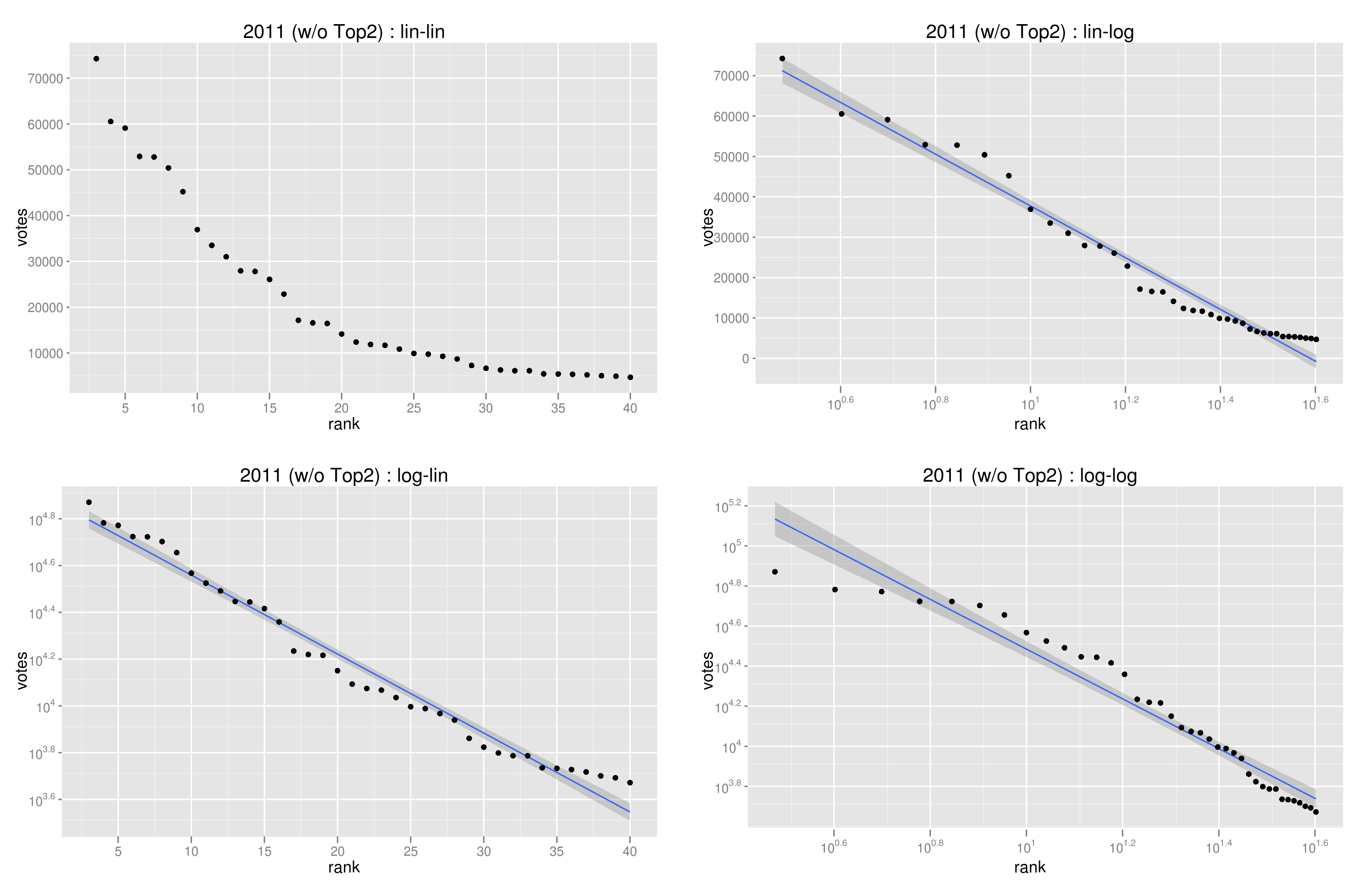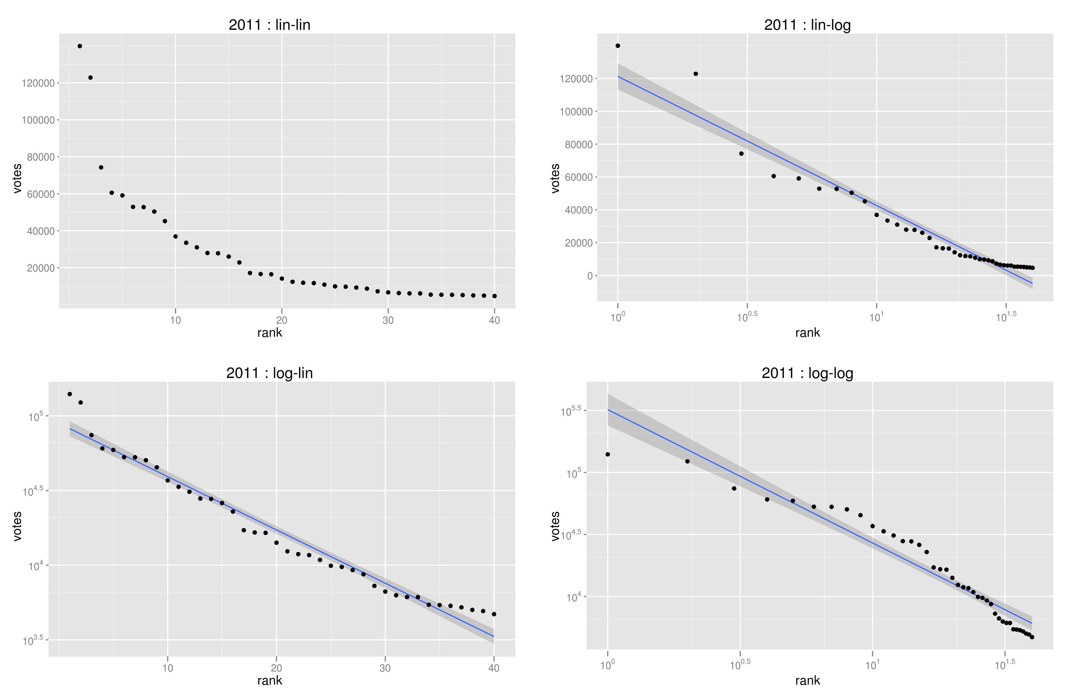 下図は、2011年のRank-frequency plotを4種類のスケールで描いたもの。lin-linは、両軸をそのままに、log-linはy軸を対数軸、lin-logはx軸を対数軸、log-logは両対数軸である。軸の取り方と得票数の分布の関係をまとめておくと