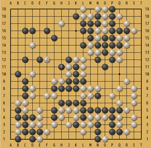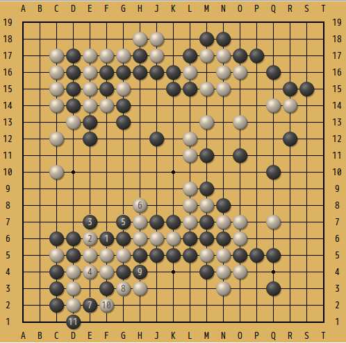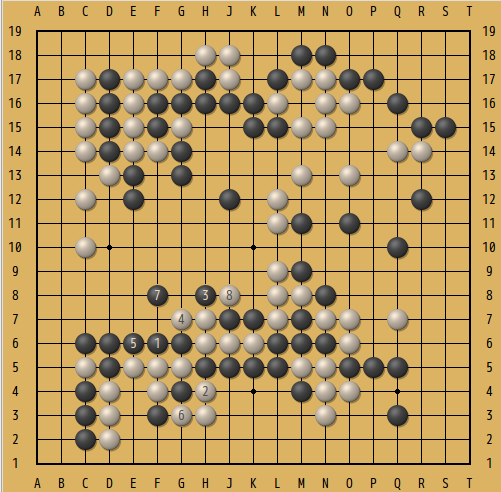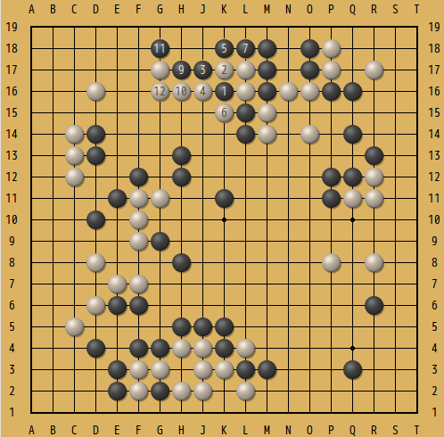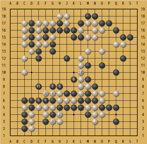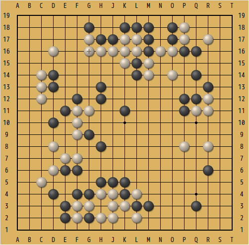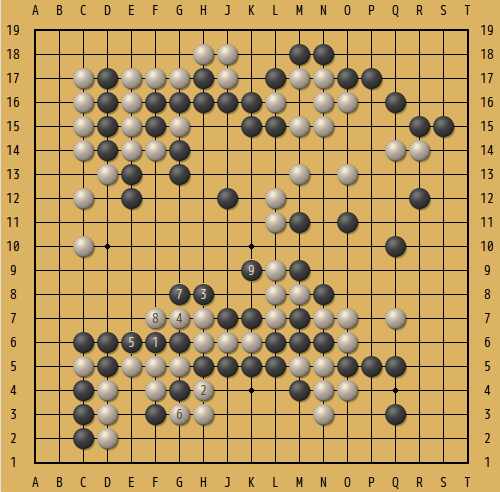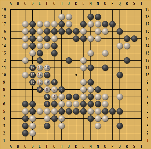 下の図がその局面。互先の黒番。下辺の黒の大石には部分的に眼形がないので、何とか脱出しなくてはいけない。△の白2子を捕獲出来るだろうか...。