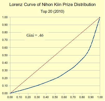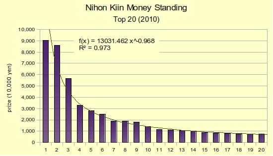 べき関数近似の決定係数が0.97と、非常に綺麗なZipf lawが観測できる(願わくば、本因坊が多少調子を崩せば完璧だった)。所得分配の研究では、高所得層の所得はべき分布(つまりZipf law)、中・低所得層では指数分布の当てはまりがよいことが知られている。トップ棋士の賞金がべきである点では共通している。データがないので不明だが、21位以下の棋士の状況はべきか指数か、あるいはそのどちらでもないか、興味深い(日本棋院所属の棋士はおよそ300人)。