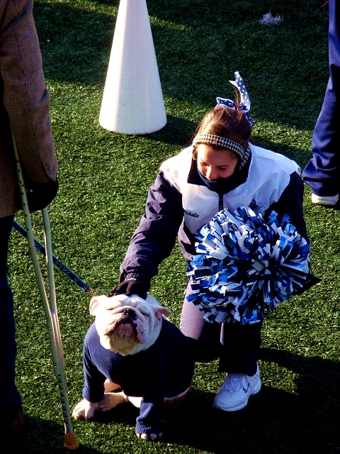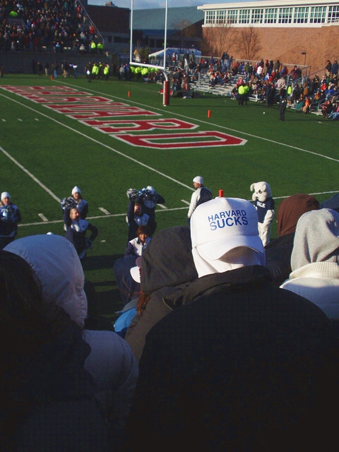 残り3分強、ハーフウェイライン付近でHarvardがパントキックを選択した時、最大の見せ場がやってきた。ボールをキャッチしたBulldogsプレイヤーが相手のタックルをすり抜けた。大外を回り左サイドライン際を走り抜ける。"GO! GO!! GO!!!" そのままtouchdownかとも思われたがゴールまで15ヤード付近で倒される。残り2分で3点差に迫れればまだ分からない。Touchdownなるか? その後Runプレイで敵陣2ヤードで1st downを獲得する。回りの連中は"Yes We Can!"と叫んでいる。残念ながらBarak ObamaはHarvard出身である。