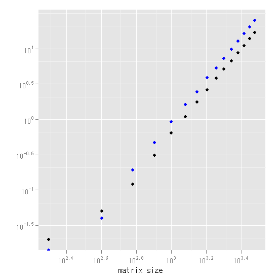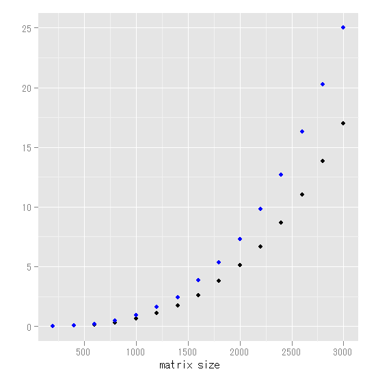 下図は、横軸に行列のサイズ(k)を、縦軸に経過時間をプロットしたもの。黒がcrossprodを使った場合で、青は行列演算を使った場合。まず、相対的に見て、crossprodが圧倒的に早いことが目に付く。両者は全く同じ結果なので、行列演算は使わないほうがいいようだ。crosspordの方を見ると、2000*2000行列で5秒、3000*3000で17秒という結果だった。これ以降はちょっと時間が掛かりすぎるので止めた。