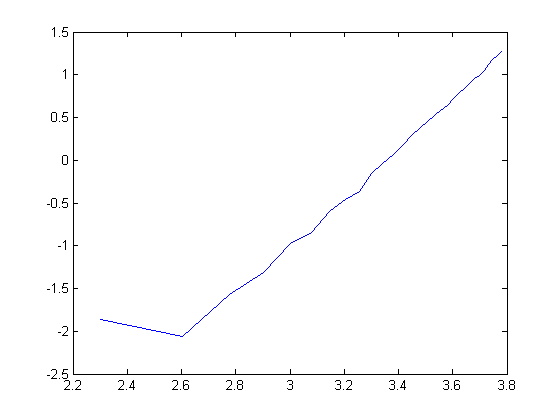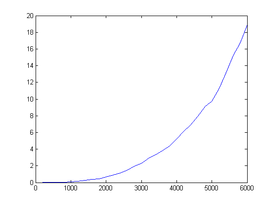 Matlabと比べるとRの遅さに驚く。サイズ2000で0.7秒、サイズ3000で2.3秒、サイズ6000で19秒だ。ちなみに、こちらも両対数を取ると直線になるから(サイズが小さい範囲は誤差だろう)、多分似たようなアルゴリズムではあるのかもしれない。関係式を推計してみると