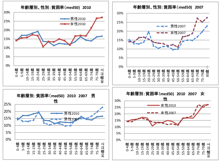 そもそも相対的貧困率というのは、可処分所得の中央値の半分未満の比率であるので、本質的に不平等指標だ。同じ人物でも比べる対象が違えば貧困になったりなくなったりする(正確には、可処分所得は世帯所得の個人割合等価という指標(世帯所得÷世帯人数の平方根)で計られる)。例えば、20ー64歳女性の枠では貧困と判定された人が、20代の中では貧困ではないことがありえる。あくまで「相対的に」なのだ。ということは、同程度の所得水準であるべき枠の中で比べなくては意味がない。極論、外資系投資銀行に勤める人51人とフリーター49人で構成されるグループで計れば、おそらく相対的貧困率は49%くらいになるけど、だからって深刻ですねえとはならない。グループの決め方が大事なのだ。