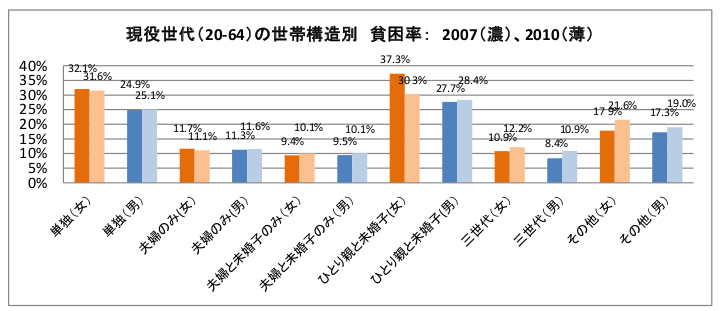 結論を出すのはまだ早い。もう少し考えてみる。上のグラフは、単に年齢別であって単身に限定していない。単身者に特有の問題がある可能性は拭いきれない。しかし、残念ながら。年齢別かつ世帯構成別の貧困率はデータに出ていないから直接は検証できない。ただ、注目すべきことに、「20ー64歳夫婦のみ世帯」の貧困率は約10%と低いのだ。