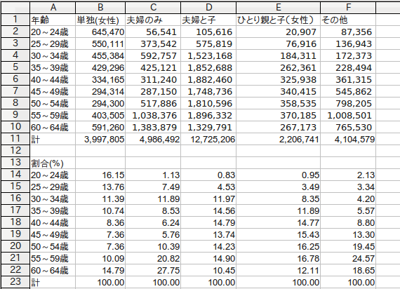 むむ、やはりこれは単身者に特有の貧困問題があるのだろうか。一つの可能性は、世帯の種類によって年齢構成比が違う、ということがある。そこで、同じ研究所が公開しているデータを見てみる→リンク。下の表は、世帯の種類別・年齢別で世帯数を比べている。単身者は若年層の割合が相対的に高いから、所得の低い年代が多いと言えるかもしれない。一方、夫婦のみに関しては、50代以降の年齢の高い層が多くて、こちらは所得の高い層が多いかもしれない。眺めてみてもよくわからんなー。